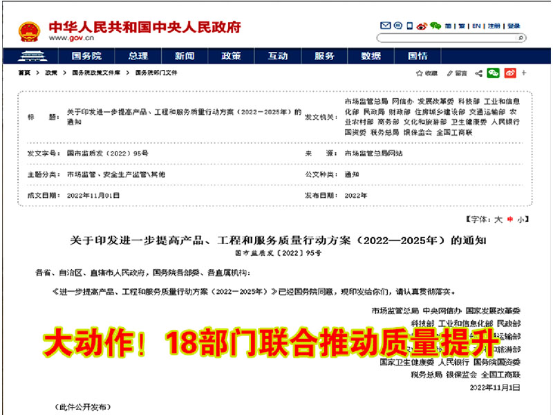 作者: 消防產(chǎn)品工作委員會近日,經(jīng)國務(wù)院同意,市場監(jiān)管總局等18部門近日聯(lián)合印發(fā)《進一步提高產(chǎn)品、工程和服務(wù)質(zhì)量行動方案(2022—2025年)》(以下簡稱《方.........