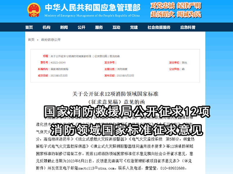 據(jù)應(yīng)急管理部官網(wǎng)消,2023年5月22日,國家消防救援局辦公室在應(yīng)急管理部官網(wǎng)發(fā)布《關(guān)于公開征求12項(xiàng)消防領(lǐng)域國家標(biāo)準(zhǔn)(征求意見稿)意見的函》。該函內(nèi)容如下: